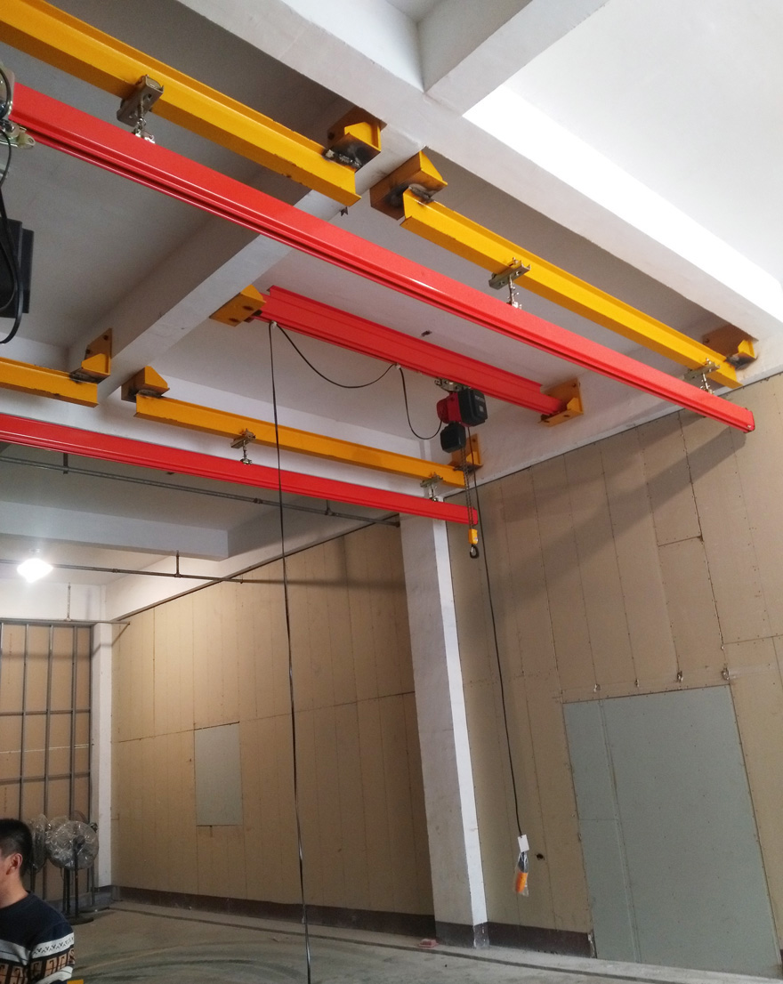 可在与主梁方向垂直的两条平行吊挂KBK轨道中运行。单梁与环链电动葫芦配套,电动葫芦运行小车可以沿着主梁方向